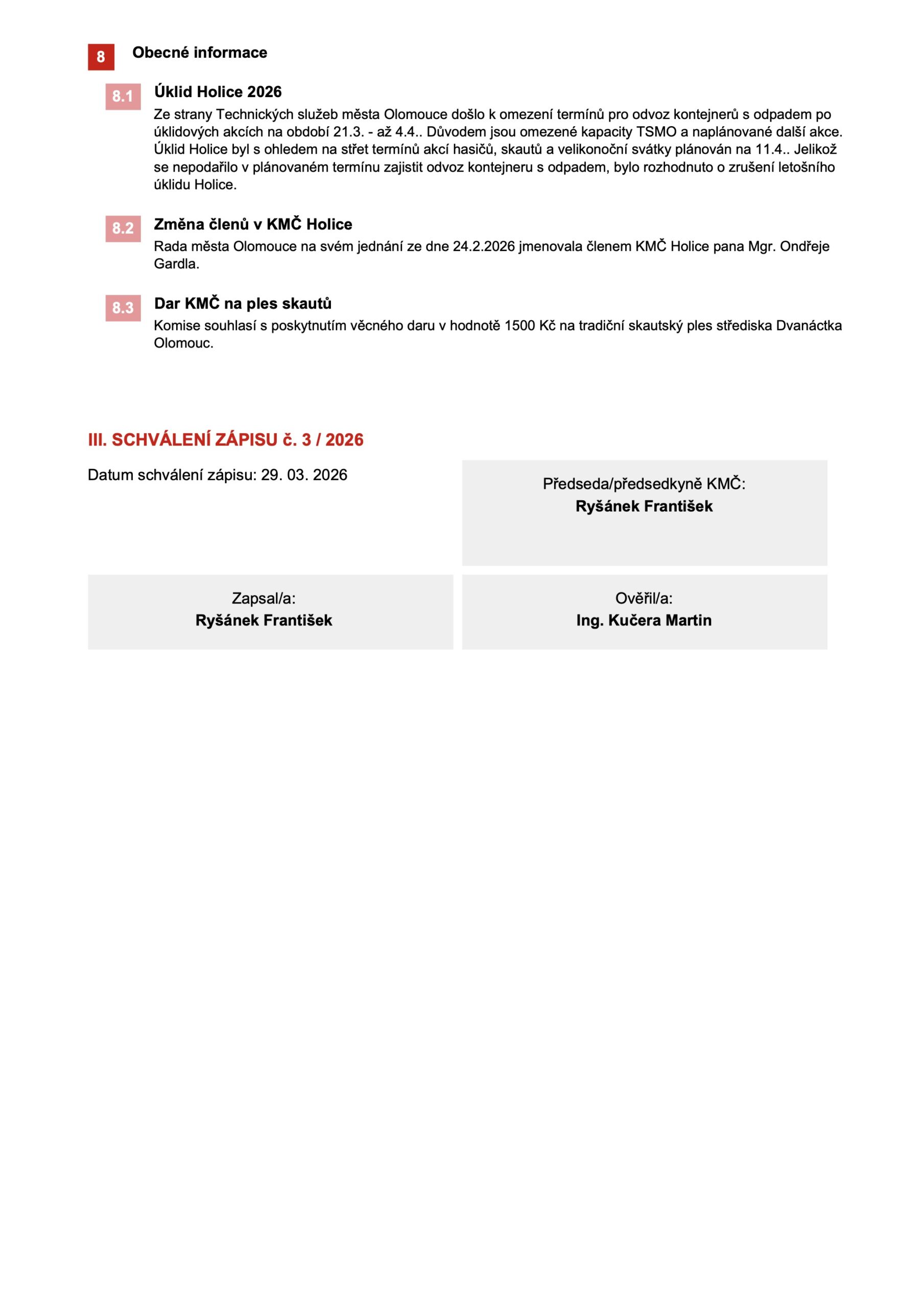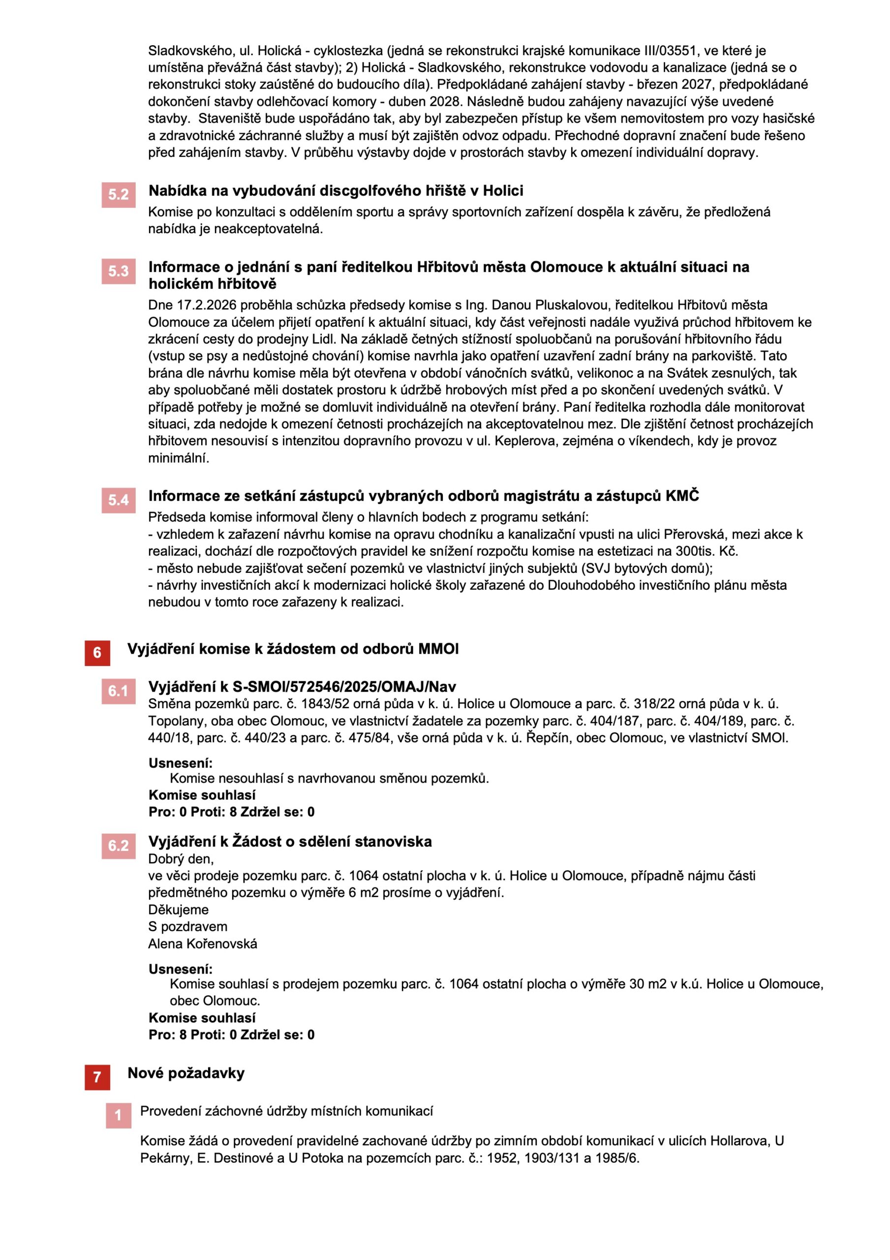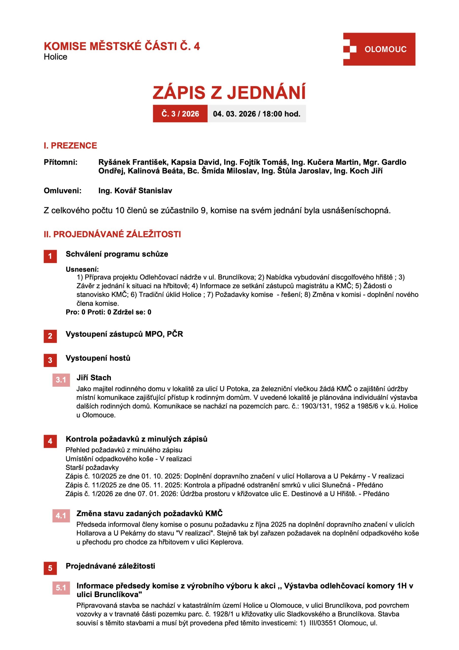 Všechny zápisy z jednání komise jsou dostupné na webu www.olomouc.eu v sekci Samospráva – Komise městských částí
